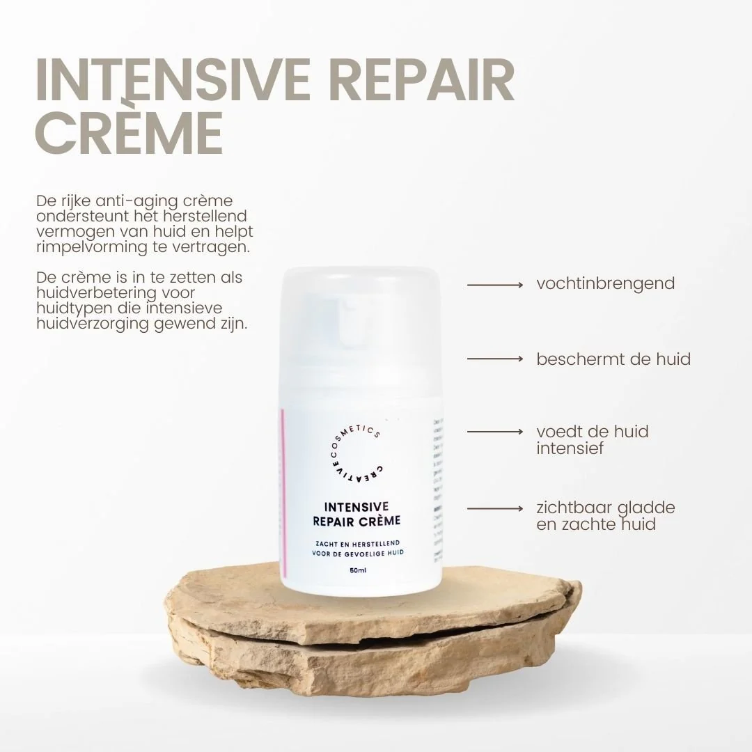 Zoek jij een intensieve voedingsde anti-aging crème met natuurlijke ingrediënten? De Natural Intensive Repair Crème van Creative Cosmetics ondersteunt het herstel van de huid, vertraagt rimpelvorming en geeft je teint weer een gezonde, blije uitstraling.